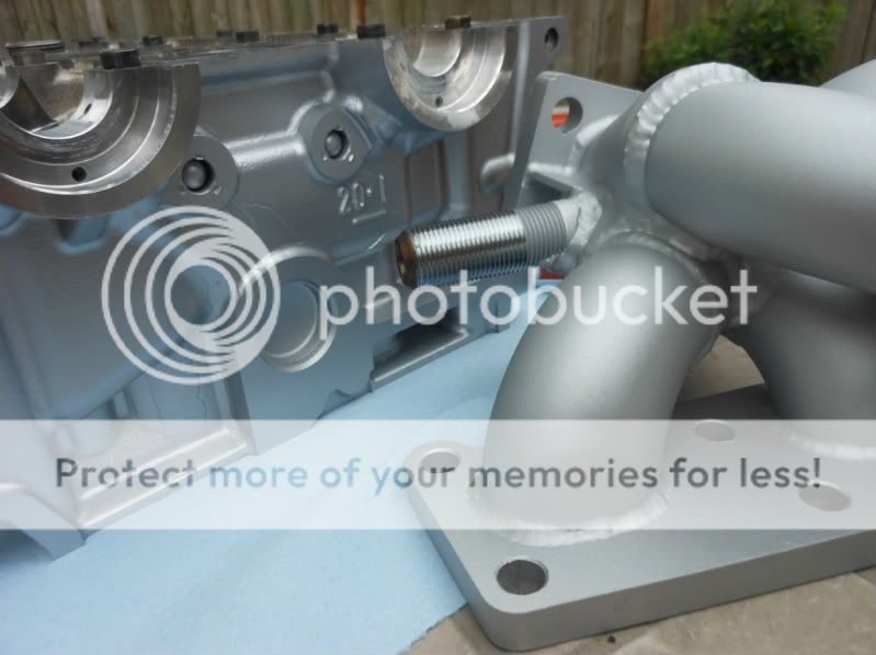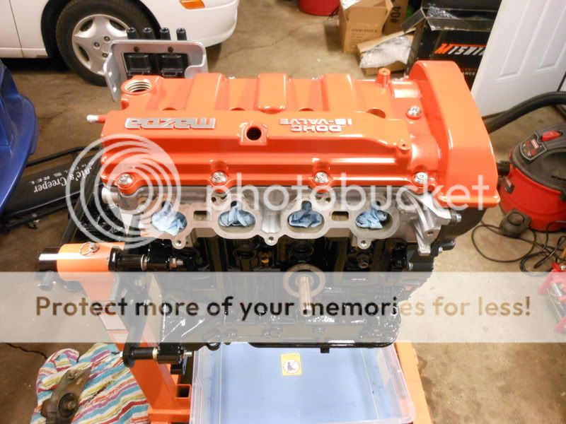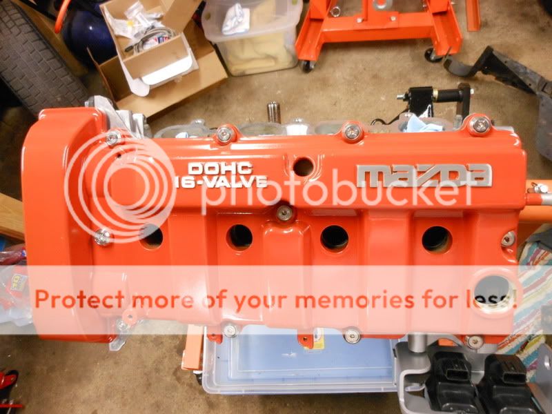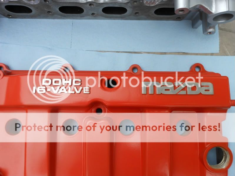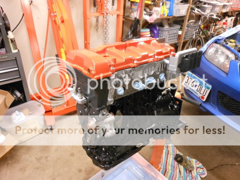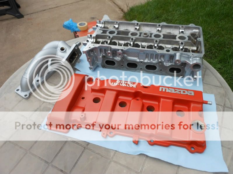Today was a busy day. Got the head all buttoned up, valve lash checked (all right in spec!), cams timed, etc. All ready for the valve cover. Speaking of which, I got the letters on the valve cover sanded like I wanted them, and put on a couple coats of clearcoat. Intake mani is painted in aluminum engine enamel just like the head (removed the VTCS flaps as well). Removed the turbine housing from my little baby turbo, got it cleaned up and ready for the same high-temp enamel I used on the turbo mani.