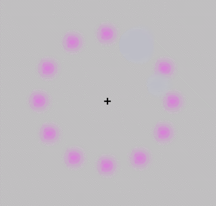 When one stares at the cross for about 20 seconds or so, one first sees a gap running around the circle of lilac disks, then a green disk running around the circle of lilac disks, then a green disk running around on the grey background, the lilac disks having disappeared or having been erased by the green disk.